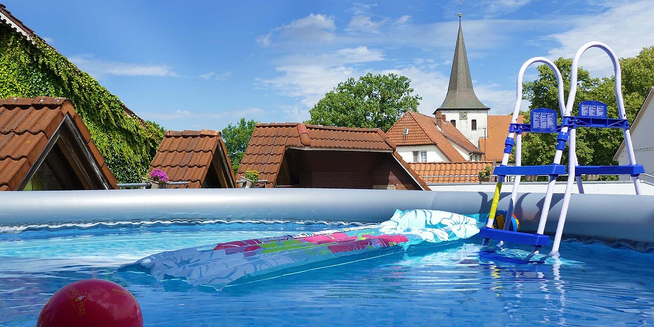 Vom kleinen Swimming-Pool auf unserer Dachterrasse schaut man hinüber zum Kirchturm. Wir sind mitten im Zentrum von Scheeßel, einer kleinen, überschaubaren Stadt, in der es fast alles gibt, was man braucht, inklusive Bahnhofsnähe: Schnell ist man in Rotenburg, Bremen oder Hamburg.